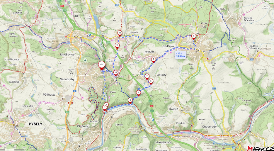 Začněte kávou v Café 33 v Senohrabech a vydejte se na cca 15 km dlouhou trasu: